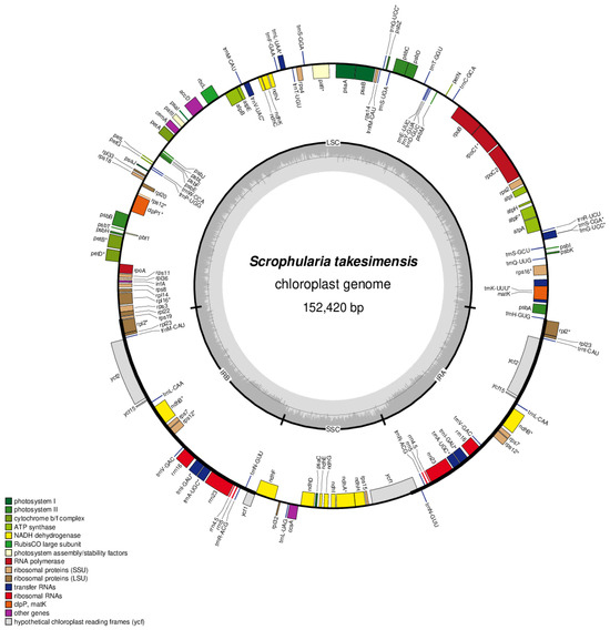 S. takesimensis was sequenced at approximately 8000× coverage, resulting in the generation of 34 Gb of raw paired-end reads and 32 Gb of trimmed reads (refer to Table S1). The entire circular chloroplast (cp) genome measured 152,420 bp in length, exhibiting the typical quadripartite structure of cp genomes. This structure comprised a pair of inverted repeats (IRs; 25,475 bp) separated by the large single copy (LSC; 83,526 bp) and short single copy (SSC; 17,938 bp) regions (see Figure 2 and Table 2). The complete cp genomes were of high quality (Supplementary Table S2). The overall guanine-cytosine (GC) content was approximately 38%, and slightly higher in the IR region (43%) than in the LSC (36%) or SSC (32%) regions. These four cp genomes comprised 114 genes, including 80 protein-coding, 4 rRNA, and 30 tRNA genes (Table S3). They had 18 intron-containing genes, 15 of which had a single intron, and 2 of which (ycf3 and clpP) had three introns with duplicate genes (ndhB, trnI-GAU, and trnA-UGC) in the IR regions (Table S4).