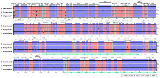 Comparison of Scrophularia cp genomes using mVISTA. The complete cp genomes of three Scrophularia species were compared, with S. takesimensis as a reference. Blue block: conserved genes, sky-blue block: transfer RNA (tRNA) and rRNA, red block: CNS. White represents the regions with sequence variation among the three Scrophularia. CNS: conserved non-coding sequences; cp: chloroplast; rRNA: ribosomal RNA; tRNA: transfer RNA.