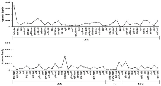 Comparison of the nucleotide diversity (Pi) values among the Scrophularia. Pi value in Scrophularia chloroplast genomes and excludes regions with Pi = 0. LSC: Large single copy; IR: inverted repeat; SSC: small single copy.