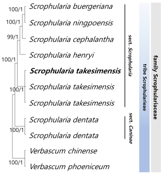 For phylogenetic analysis, a total of 11 cp genomes, including nine from Scrophularia samples, and Verbascum chinense (L.) Santapau and Verbascum phoeniceum L. as outgroups, were utilized. Among these, eight cp genome sequences were obtained from the NCBI GenBank database (Supplementary Table S1). Two matrices encompassing 78 conserved protein-coding genes (CDSs) were employed. Using MAFFT ver. 7.388 [37], the CDS sets underwent alignment. Subsequently, each aligned gene was extracted using Geneious software ver. 2023.2.1 (https://www.geneious.com; accessed on 1 January 2023.), and the genes were organized alphabetically. The concatenated gene dataset was constructed using Geneious software ver. 2023.2.1 and the CDS dataset. GBlocks ver. 5 [38] was applied to filter the alignment datasets and eliminate ambiguously aligned regions. The best-fitting model for nucleotide substitutions was determined through the Akaike information criterion in jModelTest V2.1.10 [39], selecting the generalised time reversible + gamma distributed with invariant sites (GTR+G+I) model for maximum likelihood (ML) analysis and the GTR+G model for Bayesian inference (BI) analysis. ML analysis was executed using RaxML v. 8.0.5 [40] with 1000 bootstrap replicates, while BI analysis utilized MrBayes 3.2.2 [41], involving two independent runs of four simultaneous chains for 5,000,000 generations via the Markov chain Monte Carlo algorithm. Trees were sampled every 5000 generations, discarding the first 25% as burn-ins. The trees were inferred using a 50% majority-rule consensus to estimate posterior probabilities, and the reconstructed trees were visualized using Figtree V.1.4.2 [42].