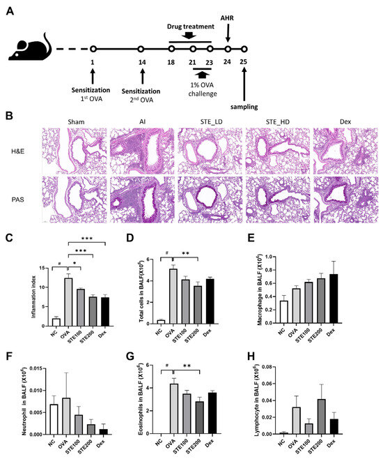 Seven-week-old female BALB/c mice (20~22 g) were acquired from Dooyeol Biotech (Seoul, Republic of Korea). The animals were maintained in a room under controlled conditions (temperature, 23 °C; relative humidity, 50%; lit electrically from 08:00–20:00; 13–18 air changes per hour). Six mice were in each cage. The mice were subjected to a week-long quarantine and acclimation period. They were housed under standard conditions, with full access to tap water and food. They were divided into the following four groups of six mice each: saline control (normal control, NC), OVA-induced asthma group (OVA, vehicle treatment), and OVA with 100 or 200 mg/kg STE by oral administration (STE100 and STE200, respectively). Moreover, dexamethasone (DEX) was used in a positive control group that was injected as previously described [23,24]. The study was approved by the Institutional Ethics Committee of Chonnam National University (CNU IACUC-YB-2022-33). All experimental design procedures are indicated in Figure 6A.