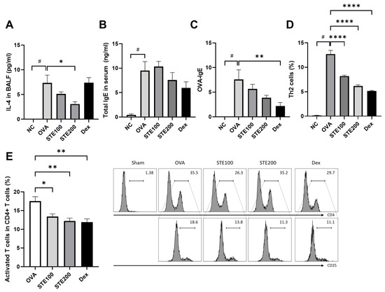 S. takesimensis Extract (STE) effectively reduces pro-inflammatory cytokines interleukin-4 (IL-4) and immunoglobulin E (IgE), as well as T cell activation, in asthmatic mice. Enzyme-linked immunosorbent assay (ELISA) was used to analyze the BALF collected from the mice, revealing IL-4 levels (A) and antigen-specific IgE (B,C) in bronchoalveolar lavage fluid (BALF). The cells were analyzed using flow cytometry. T helper 2 (Th2) cells (D) and activated T cells (E) data are shown (n = 6). NC, normal control; OVA, OVA-sensitized/challenged group; STE100, OVA + 100 mg/kg STE; STE200, OVA + 200 mg/kg STE; Dex, positive control. # p < 0.05 compared with the NC group, * p < 0.05, ** p < 0.01, **** p < 0.0001 compared with the OVA group compared with the OVA group.