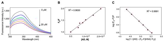 Human serum albumin is composed of a single chain containing 585 amino acids, with a unique tryptophan residue (W214) located within subdomain II A. The emission from W214 primarily dictates the fluorescence spectra of HSA in the UV range. Upon interaction with other molecules, alterations in tryptophan fluorescence may arise, influenced either by conformational changes in the protein or direct quenching effects. Accordingly, changes in HSA fluorescence were monitored to investigate the binding of HSA with the AD nanomicelles, as shown in Figure 2A. The most notable change observed in the fluorescence spectrum upon addition of AD was the quenching in fluorescence intensity (Figure 2A). Increasing concentrations of AD in the experiment led to a linear decrease in tryptophan fluorescence. Therefore, the quenching behavior could be analyzed using the Stern–Volmer equation as follows: