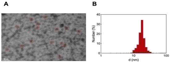 Transmission electron microscopy (TEM) analysis of the HSA/AD NM systems revealed the formation of a molecular complex exhibiting a diameter approximately 20 nm with a spherical morphology (Figure 6A). Dynamic light scattering (DLS) experiments conducted in aqueous solution provided measurements of the hydrodynamic diameter (d) and the ζ-potential (ζ), yielding values of 17.6 ± 0.3 nm (Figure 6B) and +8.3 mV, respectively. In our previous work [], the ζ-potential for pristine AD NMs was recorded as +27 mV, while literature data suggests that pure HSA typically exhibits negative ζ values around −15 mV []. This suggests that although the positively charged AD NMs primarily interacts with the negative residues of HSA, each HSA molecule within the complex aligns in a manner where its more positively charged areas are exposed to the surrounding solvent. This evidence, along with the calculated Nagg for the AD NMs [] and the molar ratio detected from the ITC experiments, supports a plausible composition of six serum proteins around a single AD nanoassembly, consistent with experimental results obtained in similar systems [].