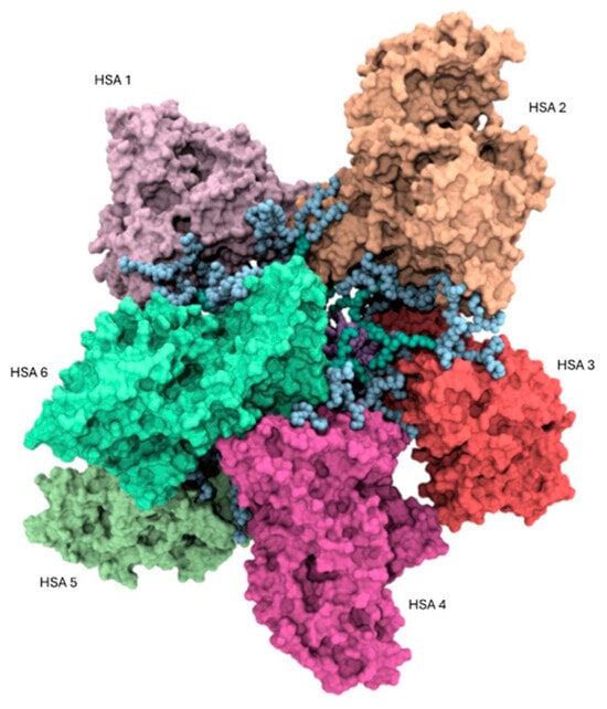 Based on the experimental findings, it is likely that HSA and the AD NMs primarily interact through surface interactions involving the polar external amino acid residues of the protein and the hydrophilic, positively charged heads of the NVs. To elucidate the interactions between these two molecular entities at the atomistic level, an investigation was initiated by examining the electrostatic potential surrounding the serum protein using Delphi 8.5 [] in conjunction with UCSF Chimera 1.17.3 []. While the serum protein typically exhibits an abundance of negatively charged amino acids under physiological conditions, the analysis revealed that these residues are not uniformly distributed on its surface. Nonetheless, a distinct surface with a notable overall negative potential was identified, particularly over the IA, IIA, and IIB domains of HSA (Figure S1), thus indicating a preferential site for binding with the positively charged AD nanomicelle. This facilitated the formation of the initial complex between HSA molecules and the AD nanomicelle. Consistent with our experimental evidence and literature data on a similar system [], the complex is composed of six protein molecules making up the PC around one self-assembled AD NM. The determination of the surface electrostatic potential enabled us to validate the 6:1 stoichiometry of the HSA/AD complex. Specifically, the ratio between the solvent accessible surface area (SASA) of the AD nanomicelle (35,618 Å2) and the SASA corresponding to the region of HSA exhibiting the most negative potential distribution (Figure S1, 5835 Å2) within a single protein yielded a value of 6.1, closely resembling the experimentally determined HSA/AD ratio. Consequently, after establishing the appropriate orientation of HSA molecules relative to AD nanomicelle, six HSA molecules were manually positioned in proximity to the AD nanomicelle. Each HSA molecule was placed at a minimum distance of 10 Å from the AD nanomicelle, with the protein molecules evenly distributed on the surface of the AD nanomicelle (Figure 7).