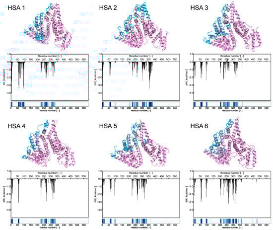 The six panels represent each HSA bound to the AD micelle in Figure 7. (top panels) HSA protein is represented by its secondary structure, and the aminoacid residues are colored in pink (no contact) or cyan (consistent contacts). (middle panels) the enthalpic free energy decomposition for each HSA residue as obtained from the MM/PBSA analysis. (bottom panels) The interaction fingerprint is based on the frequency of interaction of each HSA residue with the AD micelle. Fingerprints are colored based on the contact frequency with shades of blue: white representing 0 contact frequency while dark blue representing a constant contact throughout the MD trajectory.