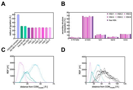 Further analysis of the atomistic MD data for the HSA/AD NM complex revealed that the overall sizes of both the HSA chains and the AD NM remain unchanged upon the formation of the protein corona, as evidenced by the corresponding value of the radius of gyrations (Rg). This parameter serves as an indicator of the compactness of a given molecular (super)structure and directly reflects its size in solution. As illustrated in Figure 9A, there is virtually no alteration in the micelle’s Rg upon formation of the HSA PC, with Rg values of 30.82 ± 0.62 Å for the AD NM alone and 30.98 ± 0.32 Å within the HSA complex.