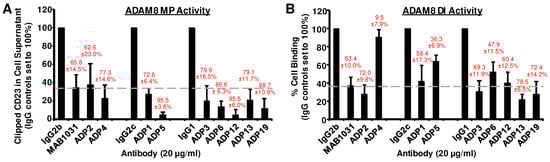 ADPs have potent in vitro dual metalloprotease and disintegrin (MP and DI) domain inhibitory activity. (A) ADAM8 MP activity was assessed in the presence of each ADP vs. its isotype-matched control IgG by measuring the release of soluble CD23 from the surface of HEK293 cells ectopically overexpressing both ADAM8 and CD23. After overnight antibody (Ab) treatment, conditioned cell media was tested for cleaved CD23 via the detection of its HA-tag in immunoblotting; images were quantified using densitometry. (B) ADAM8 DI activity was evaluated in the presence of each ADP vs. control IgG in assays measuring binding of α9β1-Integrin-expressing CHO cells to plates coated with recombinant human ADAM8 (rHuADAM8). Mean MP and DI activity level ± standard deviation (S.D.) from 3 independent experiments is graphed in A and B, respectively. The dashed line represents the level of activity in the presence of MAB1031. Ab-mediated percent inhibition of activity in each case was calculated as a decrease from control IgG levels, which were set to 100%. Mean percent inhibition for each ADP and for MAB1031 ± S.D. is given in red over the respective activity bars.