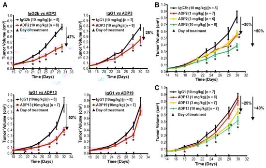 ADP2, ADP3, and ADP13 inhibit primary triple-negative breast cancer (TNBC) tumor growth in mice. (A) ADP2, ADP3, ADP13, and ADP19 were compared for their ability to inhibit pre-existing MDA-MB-231-luc TNBC cell line-derived orthotopic primary tumor growth. Female NOD/SCID mice carrying tumors of ~50–75 mm3 in volume were treated 3×/week with 10 mg/kg of the indicated ADP vs. their control IgG. Tumor growth was followed until tumors in the control group reached 1 cm3 (the limit of our IACUC protocol). Tumor volume [mean ± standard error of the mean (S.E.M.)] over time is presented. Percent tumor growth inhibition (TGI) for each ADP at the end of the experiment is given. n = number of animals/group. * p < 0.05 using a Student’s t-test. ADP2 (B) and ADP13 (C) were tested against pre-existing MDA-MB-231-luc-derived tumors as above in dose–response curves using 1, 3, 10, and 30 mg/kg vs. control IgG. Tumor volume (mean ± S.E.M.) over time is presented. Percent TGI at the end of the experiment is indicated. n = number of animals/group. *, p < 0.05 for treatment with indicated ADP dose vs. control IgG using a Student’s t-test. The 30 mg/kg dose of either ADP did not provide any additional benefit.