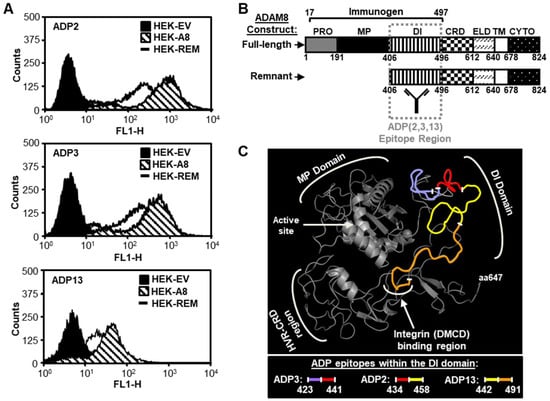 To begin to map the binding of the active ADPs ADP2, ADP3, and ADP13 to ADAM8, flow cytometry was performed using either HEK-A8 cells that express a full-length ADAM8 vector, which generates the proform and derived active and remnant forms, or HEK-REM cells that express a deletion construct lacking the PRO and MP, which generates only the remnant form (Figure 4). ADP2, ADP3, and ADP13 bound to the surface of both the HEK-A8 and HEK-REM cells (Figure 4A), indicating that Epitopes 2 and 3 were within AA407 to AA640 of ADAM8, containing the extracellular DI, CRD, and ELD shared by the full-length and remnant constructs (Figure 4B). Similar testing of additional Epitope 3 Abs (ADP1 and ADP12) confirmed this finding (Supplementary Figure S3). Given that the immunogen (Figure 4B) used to generate these Abs contains only the PRO, MP, and DI, the results suggested that Epitope 2 and 3 Abs were in fact binding within the common DI sequence (Figure 4B).