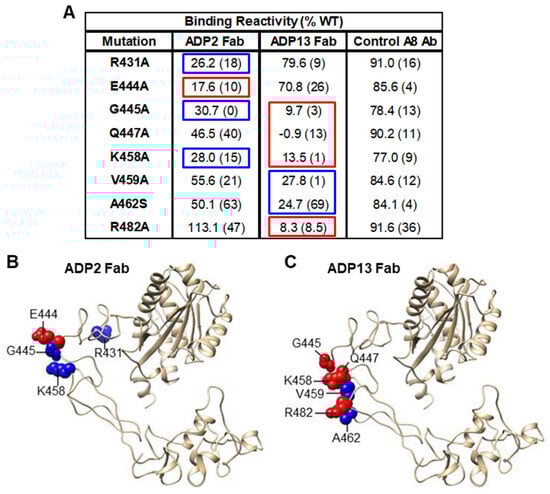 To identify the specific AAs that mediate the interaction of the top inhibitors ADP2 and ADP13 with ADAM8, shotgun ALA scanning mutagenesis was combined with high-throughput flow cytometry. For this analysis, a library of human ADAM8 expression constructs was generated with single ALA mutations introduced into each AA within the MP and DI; when ALA was the original AA, it was mutated to SER. Following transfection into HEK293 cells, the library was screened by flow cytometry using Fabs of ADP2 and ADP13, or a positive control ADAM8 Ab (Control A8 Ab), whose binding was outside the MP and DI region and therefore not affected by the mutations. Mutated residues were identified as being critical to the ADP2 or ADP13 epitope if they supported the reactivity of the Control A8 Ab but not that of the test Fab. This strategy facilitated the exclusion of mutants that are locally misfolded or have expression defects. One AA for ADP2 (E444) and four for ADP13 (G445, Q447, K458, and R482) reached the criteria for critical binding residues (i.e., the mutation maintained Control A8 Ab binding at >70% of that seen with WT ADAM8 but reduced test Ab binding to <20% of WT) (Figure 5A). Three AAs for ADP2 (R431, G445, and K458) and two for ADP13 (V459 and A462) were residues of secondary importance, i.e., that did not reach the <20% of the WT binding criterion for critical residues, but still led to a substantial reduction in Fab binding (Figure 5A). In combination with their proximity to critical residues, these findings indicated that they are part of the Ab epitope.