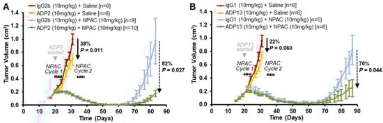 Based on superior in vivo activity (Figure 3), ADP2 and ADP13 were prioritized for further preclinical screening in orthotopic mouse models that reflect the development of locoregional relapse or distant metastases, which lead to the high mortality rate seen in TNBC patients. To assess their effect on tumor regrowth, ADP2 and ADP13 were tested with the TNBC SoC CT NPAC—a formulation of Paclitaxel—which was selected based on its greater stability and clinical efficacy compared to either Paclitaxel or Docetaxel [,]. NOD/SCID mice bearing advanced, rapidly growing MDA-MB-231-luc cell-derived mammary tumors were treated with either (a) IgG + Saline, (b) ADP2 or ADP13 + Saline, (c) IgG + NPAC, or (d) ADP2 or ADP13 + NPAC (Figure 6). NPAC was given in two cycles with one week of rest in between; each cycle consisted of 5 consecutive daily i.v. injections of 10 mg/kg NPAC. An equivalent volume of vehicle Saline was given to the control animals. ADP2, ADP13, or the respective IgG (10 mg/kg) was given by i.p. injection 3×/week throughout the time course, starting with the first CT cycle. The endpoint for the evaluation of TGI was an average tumor volume approaching 1 cm3 in the appropriate control groups.