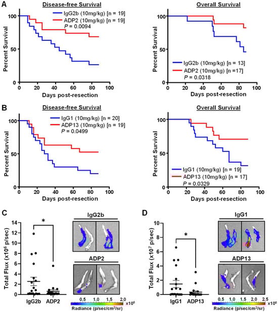 The rapid primary tumor growth seen in our pre-existing orthotopic tumor model (Figure 3) does not allow enough time for metastases to become large enough so that they can be consistently detected using live or dissected organ imaging before the mice have to be sacrificed to comply with IACUC humane policies. Similarly, in our tumor regrowth model (Figure 6), the detection of metastases is hindered by their growth delay following CT treatment and the eventual (past 26 weeks of age), natural occurrence of unrelated lymphomas and death in the NOD/SCID strain. To overcome these challenges and assess the effects of ADP2 and ADP13 on metastasis and survival, a neoadjuvant treatment protocol, in which primary mammary tumors are surgically removed, was performed. Our previous studies indicate that CTCs can be detected in the blood of mice injected with MDA-MB-231 cells as early as 7 days post-MFP injection and that the extended timeline of a neoadjuvant model, in the absence of a primary tumor, leads to consistent, detectable metastases in over 85% of mice []. MDA-MB-231-luc cells, which preferentially metastasize to the bones, were injected in the MFP of 10-week-old female NOD/SCID mice and allowed to form tumors as above. Once tumors reached ~50–75 mm3 (2 weeks post-MFP injection), the mice were treated 3x/week with 10 mg/kg ADP2, ADP13, or their control IgGs. After 1 week of treatment, when the tumors in the control group had reached ~200 mm3 in volume, all the tumors were surgically removed, and the Ab treatment continued for an additional 12.5 weeks (88 days). Recurrence of a tumor at the primary site was detected using palpation, and tumor growth followed over time. The mice were sacrificed either when the recurrent tumors reached 0.9 cm3 (as death is not an acceptable endpoint in our IACUC protocol) or on Day 88 post-tumor resection (at 25.5 weeks of age) to avoid the occurrence of any spontaneous lymphomas that could confound the results. The days from surgery to detection of a palpable recurrence and from surgery to a humane or experimental endpoint were used to generate Kaplan–Meier curves for DFS and OS, respectively. Treatment with either ADP2 or ADP13 significantly increased both the DFS and OS (Figure 7A,B). Biophotonic imaging of the bones dissected at sacrifice revealed a profound reduction in metastasis following ADP2 (p = 0.038) or ADP13 (p = 0.034) treatment, as judged by decreased luciferase signal intensity (Figure 7C,D). Thus, ADP2 and ADP13 reduce metastasis and improve the survival of animals carrying aggressive TNBC tumors.