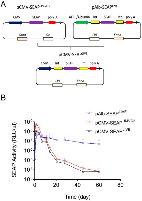 Two plasmids were employed in this study: the pCMV-SEAPUMVC3 plasmid with a pUMVC3 backbone and the pAlb-SEAPLIVE plasmid with a pLIVE backbone [23,24]. Both plasmids contain the cDNA of the human secreted embryonic alkaline phosphatase (SEAP) reporter gene, but a different promoter drives SEAP expression (Figure 1A). The aim of this experiment was to determine whether the backbone sequence of the plasmids affects the pattern of SEAP expression. A new plasmid (pCMV-SEAPLIVE) was created, replacing the Alb promoter in pAlb-SEAPLIVE with a CMV promoter cloned from the pCMV-SEAPUMVC3 plasmid. The pAlb-SEAPLIVE and pCMV-SEAPLIVE vectors have an identical DNA sequence except for a different promoter.