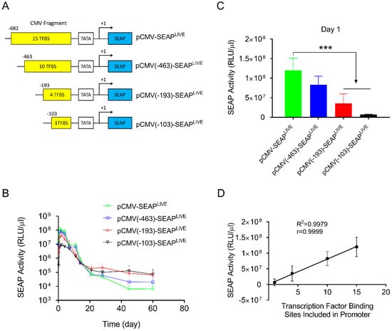 Transcription factor binding sites in CMV promoters dictate promoter strength. (A) Schematic presentation of CMV promoters with part of the promoter sequence deleted. (B) Serum levels of SEAP activity in mice injected with different plasmids. (C) Peak serum levels of SEAP activity 1 day after hydrodynamic injection. (D) Linear correlation between the number of transcription factor binding sites and the peak level of SEAP expression in mice (Pearson’s linear regression R2 = 0.9979, Pearson’s correlation r = 0.9999). The data presented are the mean ± SD (n = 5). ***, Student’s t-test, p < 0.001.