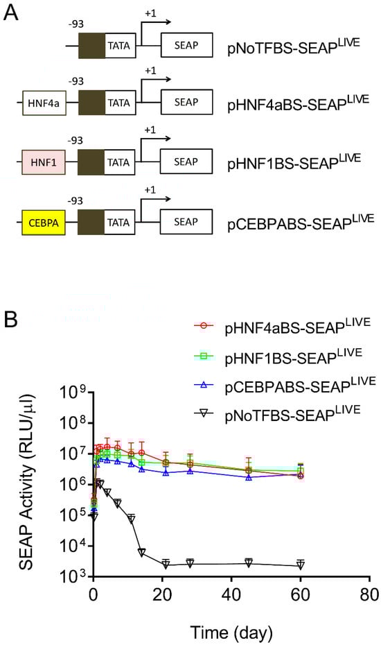 The plasmids were hydrodynamically injected into mice, and serum levels of SEAP protein were examined over time. Results in Figure 1B show that SEAP expression driven by a CMV promoter in pCMV-SEAPUMVC3 or pCMV-SEAPLIVE plasmids reached a peak level at 6 × 108 relative light units per µL of serum (RLU/µL) on day 1, followed by a 4600-fold decrease in 3 weeks. In contrast, SEAP levels in mice injected with the pAlb-SEAPLIVE plasmid peaked at around 4 × 107 RLU/µL on day 2 and sustained with time. Two months after gene transfer, the SEAP level in pAlb-SEAPLIVE injected animals was approximately 1000-fold higher than that of animals injected with either pCMV-SEAPUMVC3 or pCMV-SEAPLIVE plasmids. These results suggest that the pattern of transgene expression is determined by the promoter, and the backbones of the two employed plasmids do not seem to play an important role. The pLIVE plasmid backbone was used for constructing new plasmids containing different transcription factor binding sites.