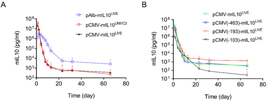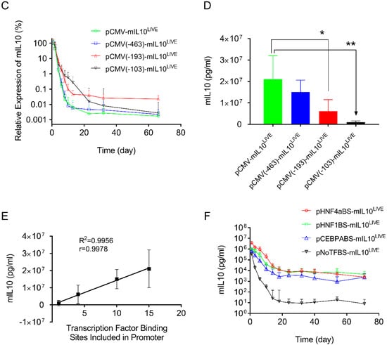 Results in Figure 1B and Figure 5A show that peak levels of SEAP and mIL10 expression are significantly higher when a CMV promoter drives reporter gene expression compared to the albumin promoter. The pattern of gene expression is highly predicted because the CMV promoter contains a significantly higher number of transcription factor binding sites. Each of which can bind to a transcription factor that enhances the binding of RNA polymerase II to the promoter to initiate transcription [30,31,32]. Our results in Figure 3A and Figure 5B show that the peak levels of SEAP and mIL10 are highest with a full CMV promoter and become lower when some transcription factor binding sites in the promoter are deleted. Plasmids with no transcription factor binding site in the promoter generated the lowest peak levels of SEAP and mIL10 (Figure 4B and Figure 5B).