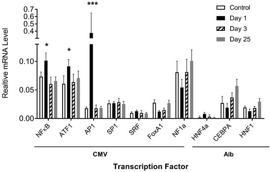 Effects of hydrodynamic gene transfer on mRNA levels of transcription factors in mouse liver. The mRNA levels of a transcription factor with binding sites in CMV and albumin promoters were determined in the livers of mice with or without (control) hydrodynamic gene transfer. The relative mRNA levels of transcription factor genes were scaled to those of the GAPDH level. The data presented are the mean ± SD (n = 3). *, p < 0.05; ***, p < 0.001.