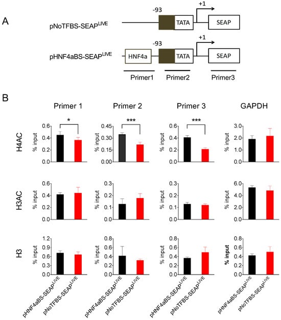 The HNF4α binding site enhances acetylated histone binding to the promoter. (A) Schematic presentation of pNoTFBS-SEAPLIVE and pHNF4aBS-SEAPLIVE plasmids and the PCR amplification sites in the ChIP assay. (B) The relative PCR product levels obtained with different primers from the immunocomplexes precipitated by antibodies against H4AC, H3AC, or H3. The PCR product level obtained from primers recognizing the GAPDH promoter region was used as the positive control. Mouse liver lysates were collected 25 days after hydrodynamic injection. The data presented are the mean ± SD (n = 4). *, p < 0.05; ***, p < 0.001.