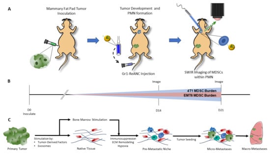 Diagram of shortwave infrared (SWIR) imaging of myeloid-derived suppressor cells (MDSCs) within the lung pre-metastatic niche with rare earth-encapsulated albumin nanocomposites (ReANCs). (A) ReANCs engineered with anti-Gr-1 antibodies target MDSCs infiltrating the lung pre-metastatic niche when delivered by tail-vein injection to syngeneic mouse models of breast cancer. (B) Study timeline depicting MDSC accumulation over time within the lung pre-metastatic niche, with a greater overall MDSC burden in the 4T1 model reflecting its high metastatic propensity compared to the EMT6 model. SWIR imaging is performed on day 14 and day 21 post-inoculation. (C) Diagram of pre-metastatic niche formation. The primary tumor secretes tumor-derived factors and exosomes to stimulate native tissue of the secondary site (lung) and bone marrow. Remodeling of the extracellular matrix, hypoxia, and immunosuppression via the recruitment of MDSCs, regulatory T cells, and macrophages results in the formation of the pre-metastatic nice. This niche is a favorable environment for seeding by circulating tumor cells and metastasis growth.