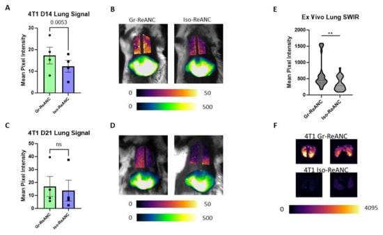 In vivo and ex vivo SWIR imaging of lungs in the 4T1 model of breast cancer. (A) Bar graphs of average lung SWIR signal on day 14 post-inoculation, demonstrating increased signal in mice receiving Gr-ReANCs with a paired-ratio t-test (p = 0.0053); data points are individual study averages (plots of individual studies are shown in Supplementary Figure S6). (B) Representative SWIR images on day 14, lung fields are plotted from 0-pixel to 50-pixel intensity and liver from 0-pixel to 500-pixel intensity. (C) Average lung SWIR signal on day 21, no significance found between Gr-ReANC and Iso-ReANC with a ratio paired t-test (p = 0.2662). (D) Representative in vivo SWIR images on day 21 in 4T1 mice. (E) Violin plot of quantified ex vivo SWIR signal. Average strength of SWIR response is higher in lungs with Gr-ReANCs compared to Iso-ReANCs (p = 0.0033). (F) Representative ex vivo SWIR images from day 21 imaging. ns = not significant; ** indicates p < 0.01.
