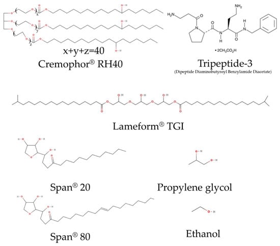 PEG-40 hydrogenated castor oil (Cremophor® RH40), and polyglyceryl-3 diisostearate (Lameform® TGI) were purchased from BASF SE (Ludwigshafen, Germany). Sorbitan laurate (Span® 20), and sorbitan monooleate (Span® 80) were purchased from Guangdong Runhua Chemistry (Yingde, China); Caprylic/capric triglyceride (CCT or Lexol® GT-865) was purchased from INOLEX Group (Philadelphia, PA, USA). Dipeptide diaminobutyroyl benzylamide diacetate (Tripeptide-3) CAS No. 823202-99-9, with purity of ≥95%, was purchased from Kangcare Biochemistry (Hong Kong, China). Tripeptide-3 standard, with purity of ≥98%, was purchased from Cayman Chemical, Ann Arbor, MI, USA. HPLC-grade acetonitrile, methanol, and deionized (D.I.) water were from RCI Labscan (Bangkok, Thailand). Trifluoroacetic acid (TFA) was purchased from Merck Schuchardt OHG (Hohenbrunn, Germany). All other chemicals were of the highest grade available.