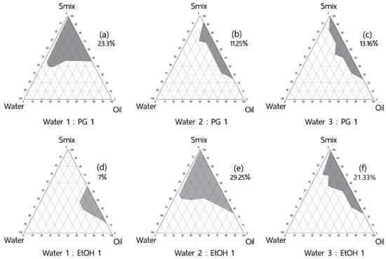 Effects of co-solvent and ratios of water to co-solvent on microemulsion formation were determined. Isotropic area in ternary phase diagrams where the aqueous phase consisted of ethanol (EtOH) or propylene glycol (PG) at various ratios with D.I. water (1:1, 1:2, and 1:3) was determined by aqueous phase titration into the various ratios of the pre-mixed oil: Smix (Section 2.2). The Smix given the highest single-phase area from Section 2.2.1 was employed for the comparison of different water/co-solvent combination effect. Visual evaluation for the isotropy was performed for the ME extent in pseudoternary phase diagrams.