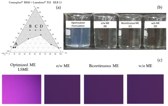 The effect Lameform® TGI as a co-surfactant: (a) pseudoternary phase diagram and the microemulsified area of CCT/Smix Cremophor® RH40 and Lameform® TGI at HLB 13 as a function of an aqueous phase (water:PG, 1:1); (b) MEs from point B, C, D, and the optimized formulation derived from point A; (c) polarized light microscope images show isotropic microstructure of all formulations. In the pseudoternary phase diagram (a), point A was selected for fine-tuned optimization using the design of experiment, while points B, C, and D were selected as the conventional MEs for comparison of skin permeability.
