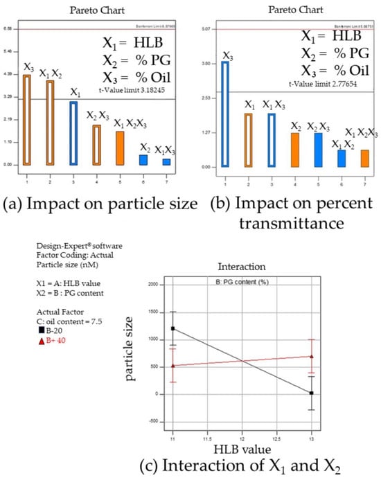The Pareto chart obtained from the Design Expert® program demonstrates a statistically significant variable factor (above t-value limit) impact on responses: (a) indicates X3 (oil content) and interaction between X1 (HLB value) and X2 (PG content) exhibited statistically significant impact on particle sizes of ME; (b) shows statistically significant effect of oil content on percent transmittance of ME; and (c) demonstrates X1 (HLB value) and X2 (PG content) interaction effect on particle sizes of ME from DoE experiment when oil content was constant; the lowest particle size (■ black line) was formed when HLB value of Smix and % PG were 13% and 20% in the formulation.