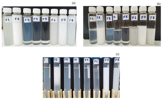 Stress stability studies of micro- and nanoemulsion preparations from the DoE study (a) overnight after preparation; (b) 6 cycles of heating and cooling between 4 and 40 °C, each for a period of 48 h, and (c) after 30 min of 10,000 rpm (25,830× g) centrifugation.