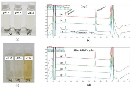 Physical and chemical stability of the optimized formulation with adjusted pH of 4.5, 5.0, and 6.0 at Day 0 (a). After six heating/cooling cycles, pH 5.0 shows slight yellow (B), while pH 6.0 turns to full yellow (C). No color change occurred in pH 4.5 formulation (A) (b). The HPLC chromatograms of Tripeptide-3 revealed the chemical stability of the Tripeptide-3 in the optimized formulation at different pH: (c) represents Day 0, (d) represents after 6 H/C cycle of optimized formulations, with (A) in pH 4.5, (B) in pH 5.0, (C) in pH 6.0, and (D) a standard Tripeptide-3. Paracetamol, an internal standard, and the Tripeptide-3 peaks were eluted at retention times of 7.6 min and 20.5 min., respectively.