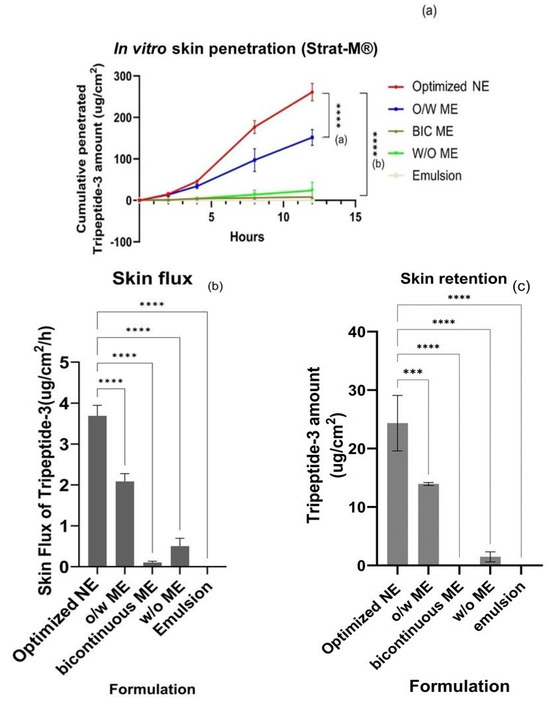 Strat-M® is a widely used artificial skin for permeation study. It is an artificial membrane envisioned as an alternative to animal and human skin with similar factors as skin layers to mimic human skin. This multi-layer artificial membrane possesses a tight top layer coated with a lipid blend resembling the lipid chemistry of the human stratum corneum (SC) and a porous lower layer resembling the epidermis and dermis layers. The validation against EpiSkin® RHE and human excised skin revealed closer permeability results to those from the excised human skin. Therefore, this study decided to use Strat-M® instead of human skin or animal skin for the skin permeation study [46,47]. The difference in the cumulative amount and skin flux of Tripeptide-3 test formulations for 12 h was shown in Figure 8a,b. The optimized Tripeptide-3 NE showed a statistically significant higher cumulative amount and skin flux over other test formulations, especially the simple O/W emulsion of Tripeptide-3, which had not been detected in the receiver at all studied time points. The ultra-high surface area of optimized Tripeptide-3 NE droplets and lower viscosity when using lower surfactant percentages may be the critical factors for improving skin permeability compared with other high Smix in MEs [41]. NEs with lipidic structures are considered ultra-flexible and likely to form any shape during transportation through the skin. With the droplet size below 50 nm, the higher penetration to the deeper layer of the skin by passive diffusion and appendage shunt pathways such as hair follicles and sweat glands was enhanced [47,48,49]. The content of propylene glycol (PG) in the developed systems in the optimized NE, O/W ME, bicontinuous ME, and W/O ME were 20%, 22.5%, 12.5%, and 7.5%, respectively. Having ultra-fine droplets and a high penetration enhancer (PG) in the NE system, membrane fluidity and the interaction of the carriers with the skin were promoted, allowing the exchange between the outermost layers of the stratum corneum and the carriers [49]. However, the Strat-M® membrane only differentiates the penetration ability by passive diffusion among different formulations.