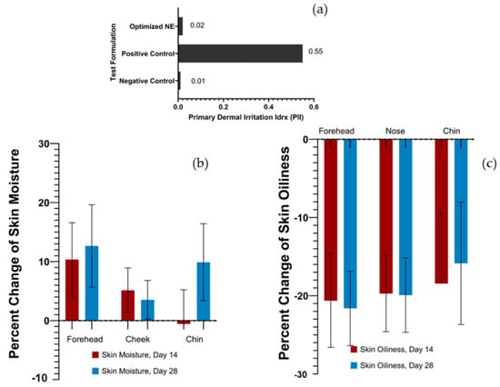 In this study, not all volunteers exhibited skin-refining improvement. The great variation is impacted by various factors such as genetics and lifestyle that influence facial pore enlargement. In addition, the existing collagen density on the face compromised the refining effect [53]. The optimized NEs from this study did not show an advantage on porphyrin reduction. Porphyrin is a compound derived from Cutibacterium acnes. The presence of porphyrin is related to sebaceous gland activity and sebum content [54,55]. High sebaceous gland activity or high sebum secretion frequently causes a high amount of porphyrin. Nonetheless, the porphyrin amount depends on bacteria metabolism rather than facial oil content [56].