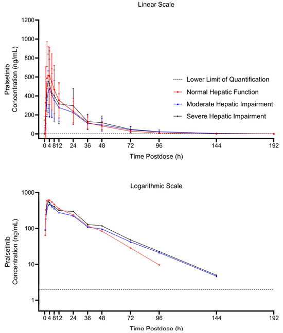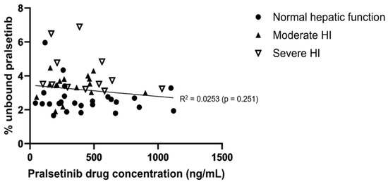 Unbound Cmax and unbound AUC0–∞ and the associated statistical analysis of pralsetinib classified based on Child–Pugh score are presented in Table 2. The geometric mean of the fraction unbound (fu) was approximately 31% or 60% higher for subjects with moderate or severe hepatic impairment, respectively, compared to subjects with normal hepatic function. The higher fu values resulted in numerically higher systemic exposure to unbound pralsetinib in subjects with moderate or severe hepatic impairment compared to subjects with normal hepatic function, based on GMRs ranging from 1.14 to 1.31 for subjects with moderate hepatic impairment and from 1.29 to 1.64 for subjects with severe hepatic impairment. Pralsetinib protein binding was not dependent on the drug concentration over a range of total pralsetinib plasma concentration from 41.9 to 1120 ng/mL (Figure 3).