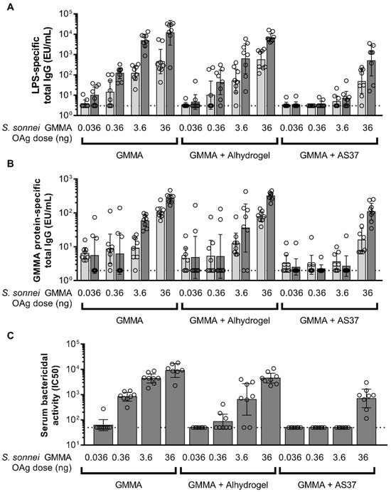 S. sonnei-specific humoral responses elicited upon vaccination with GMMA either alone or with Alhydrogel or AS37. Five-week-old CD1 mice were immunised intramuscularly (50 µL, 25 µL/leg) on study days 0 and 28. Mice were bled on study days −1, 27, and 42. LPS-specific (A) and S. sonnei GMMA protein-specific (B) total IgG responses were quantified by ELISA. Antibody complement-mediated functionality in killing S. sonnei (C) was assessed by SBA. The GMMA dose (quantified as total OAg) received by animals in each immunisation group is reported below each graph. Individual IgG levels are reported in the graphs (symbols) together with geometric means (bars) and 95% CI. Light grey bars represent the geometric means after the first immunisation, whereas dark grey bars represent the geometric means after the second immunisation. Dotted lines represent the level of antibodies (A,B) or the bactericidal activity (C) of preimmune sera.
