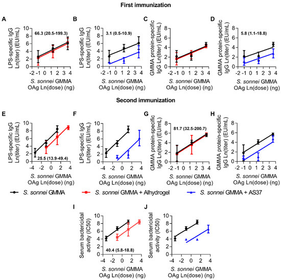 Comparison of S. sonnei-specific humoral responses elicited upon vaccination with GMMA either in the absence or presence of the two tested adjuvants. Five-week-old CD1 mice were immunised intramuscularly (50 µL, 25 µL/leg) on study days 0 and 28. Mice were bled on study days-1, 27, and 42. LPS-specific (A,B,E,F) and S. sonnei GMMA protein-specific (C,D,G,H) total IgG responses and antibody complement-mediated functionality in killing S. sonnei (I,J) observed in mice immunised with unadsorbed S. sonnei GMMA (black lines) were compared to those elicited by S. sonnei GMMA adsorbed on Alhydrogel (red lines) or S. sonnei GMMA adsorbed on AS37 (blue lines) by the parallel line approach with the possibility of changing the dose range (PLAS). Each curve is represented with the log-transformed dose on the abscissa and the log-transformed ELISA units or SBA titres on the ordinate (natural log was used for both transformations). For each formulation type, three out of four consecutive doses were used by selecting the dose range that provided a higher slope for the linear curve; no weight function was used for the regression. For each formulation type, the chosen dose range in the comparison could be different (PLAS). The calculated relative potency with a 95% confidence interval is reported in the graph when applicable. Relative potency was not calculated when the dose–response was evaluated as nonlinear.