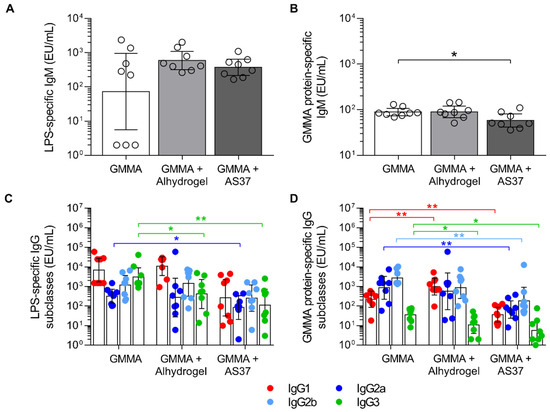 The levels of LPS-specific IgM were comparable in the sera of mice of the three immunisation groups, even if some animals showed no detectable IgM after immunisation with unadsorbed GMMA. The levels of GMMA protein-specific IgM were lower in mice immunised with S. sonnei GMMA+AS37 in comparison to unadsorbed GMMA (Figure 3A,B).