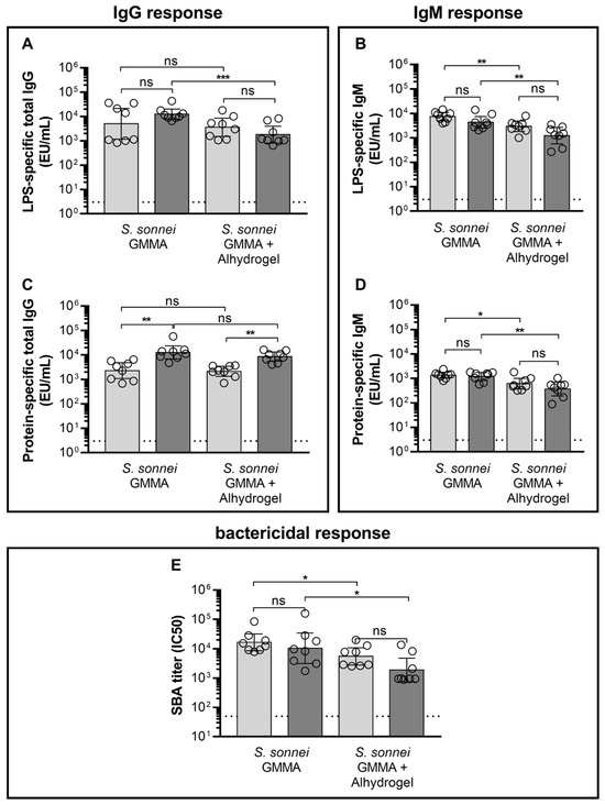 Finally, the antibody functionality paralleled the results obtained for LPS-specific IgG and IgM (Figure 4E), with unadsorbed GMMA eliciting higher SBA titres than GMMA adsorbed on Alhydrogel.