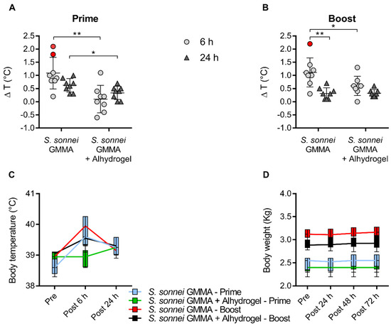 Rabbit body temperature and weight changes after vaccination with S. sonnei GMMA either unadsorbed or adsorbed on Alhydrogel. Female New Zealand White rabbits were vaccinated intramuscularly (0.5 mL) on study days 0 and 28 with 15 µg of S. sonnei GMMA (quantified as OAg). Rabbit body temperature (A–C) was monitored before and 6 and 24 h after each immunisation. Body weight (D) was measured before immunisation and 24, 36, and 72 h after each vaccination. Mean and standard deviation for all groups and individual values of ∆T (°C) are reported in graphs (A,B) (∆T > 1.5 in red). Changes in T (°C) and weight (Kg) during the time after vaccination are reported in box and whisker graphs (plotting min to max values, (C,D)). * p < 0.05, ** p < 0.01; A paired parametric t-test was performed between different time points, and an unpaired parametric t-test was performed between different immunisation groups.