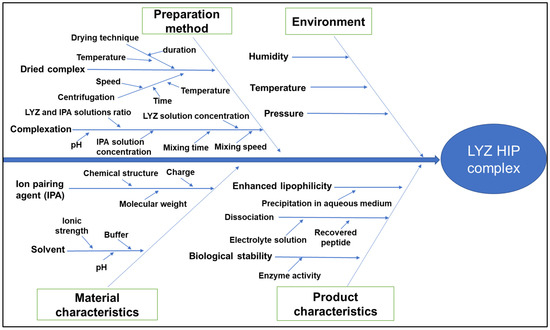 As mentioned before, RA is one of the most important tools of the QbD approach. This assessment was commenced by a comprehensive revision of the reports dealing with the HIP complexation in general and of LYZ in particular. In addition to that, the pilot experiment reported in the previous section and the experience of our research group helped in identifying the possible parameters that could affect the quality of the prepared complex. A cause-and-effect diagram was built, showing the root causes that affect the quality of the LYZ HIP complex (Figure 1).