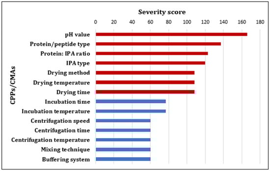 Pareto chart showing the ranking of the critical material attributes (CMAs) and critical process parameters (CPPs) for the preparation of the peptide/protein HIP complex (red color: high risk factors, blue color: low risk factors).