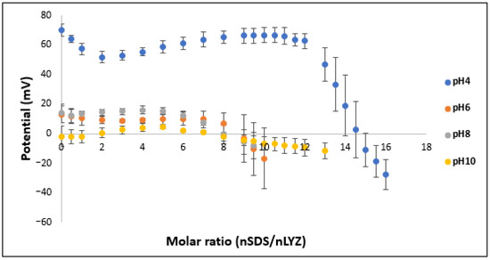 Titration curve representing the change in streaming potential (mV) upon the addition of small increments of a 7 µM SDS solution to a 2 mg/mL LYZ solution at pH 4, 6, 8 and 10. The intersection of the curves with a zero potential line represents the average SDS/LYZ molar ratios of three measurements at the neutralization point.