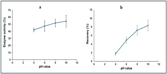To confirm the results of the titration experiment, the obtained molar ratios, namely 14.6, 9.2, 8 and 7.5 SDS/LYZ at pH 4, 6, 8 and 10, respectively, were used experimentally to prepare the complex. A high yield of complexation above 95% was obtained for complexes prepared at pH 4, 6 and 8 (Figure S5). Lower complexation efficiency was obtained at pH 10, which can be justified by the closeness of this value to the isoelectric point of this peptide; consequently, a lower number of ionizable groups is available for the complexation interaction. Moreover, the enzymatic activity of the complexed LYZ was measured after inducing dissociation upon the addition of 2 mL of a 0.5 M NaCl solution to the dried complexes and incubation for 24 h (Figure 4a). In contrast to the complexation efficiency results, the complex prepared at pH 10 showed the highest enzymatic activity while that prepared at pH 4 showed the lowest value. This can be justified by the recovery % outputs (Figure 4b) as they showed the same pattern; therefore, the lower enzymatic activity obtained from LYZ prepared at pH 4 was due to the lower dissociated amount of this enzyme. However, as the complexation yield at pH 10 was much lower than others, this pH value was excluded from further investigations.