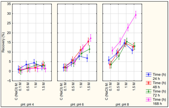 In general, the results obtained for both responses from the complex prepared at pH 4 were much lower than those prepared at the other two pH values. Also, it could be observed from the graphs that the highest enzymatic activity and recovery (%) were at the 1 M NaCl and 24 h incubation period in case of pH 4, while the highest response values were at the 1.5 M solution after 168 h of incubation in both complexes, prepared at pH 6 and 8. All effects (main effects and interactions) were statistically significant (p < 0.05). As a general trend, increasing the pH, NaCl concentration and incubation time resulted in increased enzymatic activity and recovery (%). Higher enzyme activity can be correlated partially with the higher obtained dissociated amount of the protein. The differences in recovery (%) from complexes prepared at the same pH value upon changing the incubation time were not significant except for pH 8 and 168 h of incubation. In complexes prepared at the same pH value, increasing NaCl concentration resulted generally in increased recovery (%). The differences were significant (p < 0.05) at pH 6 and 8 but were not significant (p > 0.05) for the complexes prepared at pH 4. As the values of both responses obtained from complexes prepared at pH 4 were much lower than those prepared at pH 6 and 8, the former pH value was excluded from further investigations.