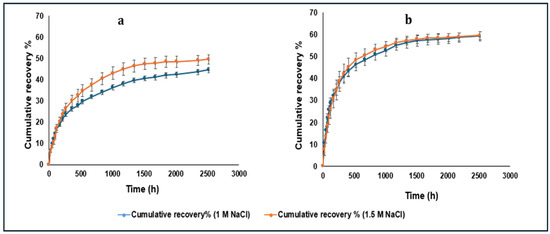 Cumulative recovered amount of LYZ from the complexes prepared at pH 6 (a) and 8 (b) upon addition and incubation in 1 M and 1.5 M NaCl solutions (average of five measurements).