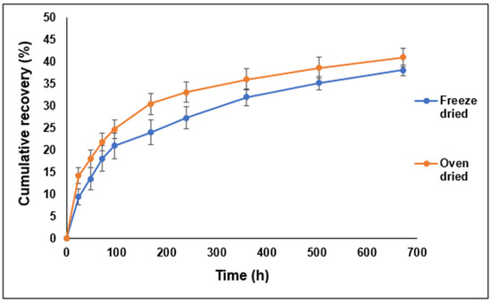 Cumulative recovery (%) of LYZ dissociated from the complexes prepared at pH 8 and dried by the freeze-drying and ventilated oven technique upon addition and incubation in 1 M NaCl solution (average of six measurements).