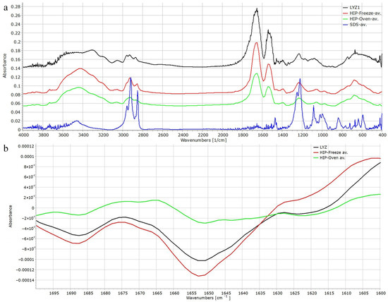 To characterize the complex formation and secondary structure of LYZ in the HIP complexes prepared at the optimum pH and molar ratio and dried by the oven and freeze-drying methods, the infrared spectra of the LYZ, SDS, oven-dried HIP and freeze-dried HIP complexes were obtained using an FT-IR spectrophotometer (Avatar 330 FT-IR, Thermo Fisher Scientific Inc., Waltham, MA, USA) with the potassium bromide pressed disc method. The samples were scanned for absorbance in the wavelength range of 600–4000 cm−1. The spectra were obtained from 128 scans with a spectral resolution of 4 cm−1 and applying H2O and CO2 corrections. SpectraGryph software (version 1.2.15.; Dr. Friedrich Menges Software, Entwicklung, Germany) was used to evaluate the results.