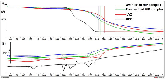The thermoanalytical behavior of the HIP complexes prepared at the optimum pH and molar ratio and dried by the oven and freeze-drying methods was investigated using a Mettler-Toledo TGA/DSC1 instrument (Mettler Toledo GmbH, Greifensee, Switzerland). The thermograms of LYZ, SDS, oven-dried HIP complex and freeze-dried HIP complex were obtained by placing 7–11 mg of samples in sealed aluminium pans with 2 holes on top (100 µL) and inserting them into the calorimeter. The starting temperature in the measurement was 25 °C and the end temperature was 500 °C. The heating rate was 10 °C/min. The samples were investigated under a flow of anhydrous nitrogen with a flow rate of 50 mL/min. STARe SW 16.30 software was used to evaluate the results and each measured sample was measured minimum twice.