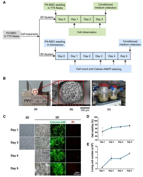 The 3D culture of MSCs. (A) Schematic diagram of scale-up expansion of MSCs from 2D system to 3D system. (B) Image of tablet of microcarriers before dissolution (a); SEM image of a single microcarrier. Scale bar = 100 μm. (b); and image of 3D spinner flasks with MSCs and microcarriers in serum-free medium (c). (C) Images of 2D-MSCs on Day 1 and Day 3 and that of 3D-MSCs on Days 1, 3, 4 and 5. The 3D-MSCs in microcarriers were visualized using Calcein-AM (green) and PI (red) staining. Scale bar = 400 μm. (D) Cell viability of 3D-MSCs. (E) The living cell number of 3D-MSCs.