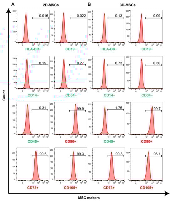 The flow cytometry analysis of 2D-MSCs (A) and 3D-MSCs (B). The negative surface markers: HLA-DR−, CD19−, CD14−, CD34− and CD45− (green). The positive surface markers: CD90+, CD73+ and CD105+ (red).